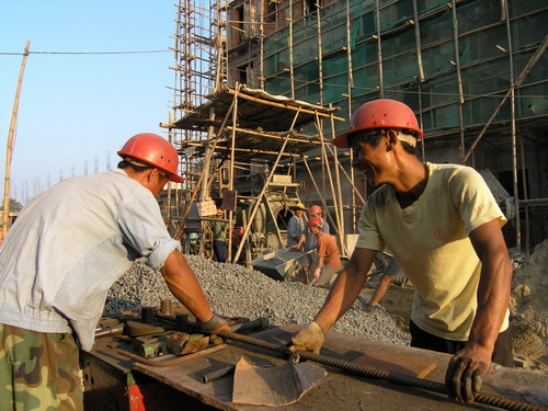 总投资6500多万元的潘村湖农场移民迁建工程正按预定工期快速推进,各承建单位全部进场施工,目前已有21栋移民楼开工建设。图为建筑工人正在施工现场紧张工作的情景。(杨登宏)