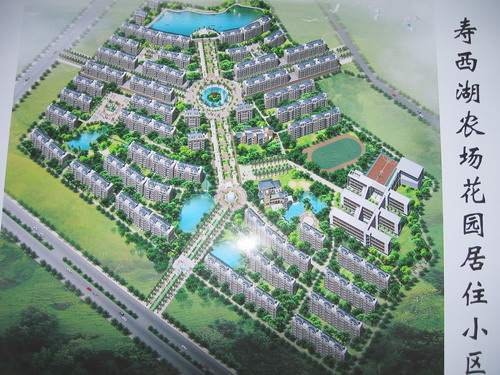 寿西湖农场移民迁建的园区已题名为“西湖花园”,合肥工业大学安徽农垦集团惠州分院和寿县城乡规划安徽农垦集团共同承担园区的规划设计。两院的院长结合规划设计效果图,分别从区位处置、规划布局、设计理念、建筑设计和交楼标准等方面为与会人员作了全面而细致的绍介: “西湖花园”位于同农场比邻的南关村高地,距寿县城关不过百米。全园建筑面积约19万平方米,分成五个组团和一条购物商业街。整个园区通过中心地段的休闲广场、喷泉和公共绿地有机地组合在一起,并在广场的中轴线上设立了一座雕塑。园区内道路宽阔,四通八达,设有2至3个主出口,同时配有幼儿园、学校、会馆(包括管理中心、服务中心和游乐中心等)、停车场和观景塔(花园的标志塔)。园区的给排水、电缆、网线等全部从地下通过。每个组团有若干栋楼房,每栋楼房六层,分两个单元。楼房全部为砖混结构,设有构造柱,七级设防。全园有十大户型,以三房两厅为主,分70平方米、80平方米、90平方米和110平方米等不同面积。大部分套房都是双阳台、双卫生间,每套住房主阳台、主居室、主客厅全部朝阳。所有的房间全部是大门窗节能设计,自然通风,自然采光。鸟瞰“西湖花园”,花木掩映,楼宇错落;绿水环绕,曲径通幽。两位院长介绍得出神入画,大家听得也心驰神往。不时有职工提出疑问,都能得到满意的答复。整个会场群情热烈,笑语连连。大家一致认为:园区布局自然流畅,户型设计理念新颖,楼房结构美观大方,工程造价经济合理。“西湖花园”是一处自然化和人性化适宜居住的生活小区。