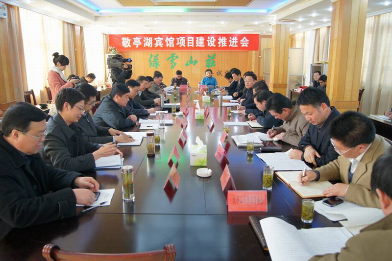 为扩大垦地合作成果,加快项目建设进度,3月14日下午,安徽农垦集团与宣城市人民政府在敬亭山茶场绿雪山庄联合召开了敬亭湖宾馆项目建设推进会。省农垦集团董事长田文俊、宣城市市长虞爱华出席会议。省农垦集团副总经理程军、陈仁虎以及省农垦皖南开发指挥部负责同志,宣城市政府秘书长牛传勇以及市直相关部门、宣州区政府主要负责人参加了会议。