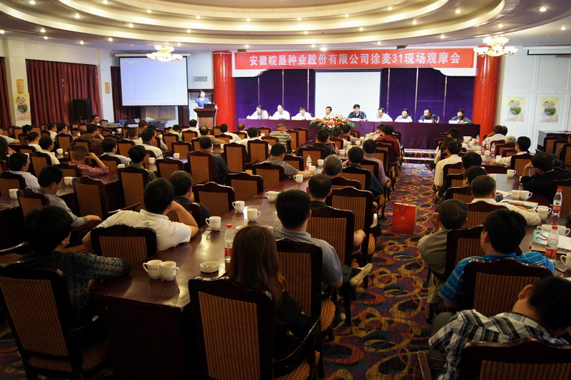 会议背景:“徐麦31”系最新国审的优质强筋小麦新品种。2009年通过江苏省审定,品种审定编号为苏审麦200904;2011年通过国审,品种审定编号为国审麦2011005,国家植物新品种保护申请号20090488.8,公告号CNA005901E,皖垦种业买断了“徐麦31”在安徽、河南的独家永久生产经营权。该品种田间表现优异,主要优点:株型紧凑弹性好,苗势健壮成穗多,抗病抗倒熟像好,穗大无芒品质优。