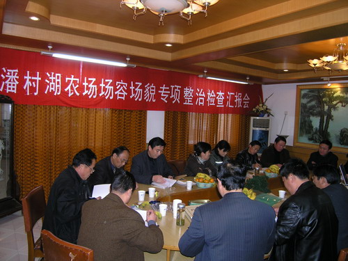由龙亢和大圹圩两场召集,白米山、方邱湖、砀山、夹沟、潘村湖等七场分管领导和部门负责同志组成的安徽省农垦系统场容场貌整治第一互查组于12月2日在潘村湖农场开展检查活动。省农垦集团公司监察室等有关同志参加了本次检查活动。互查组一行深入分场营区、科研站所、企业车间、街道社区、学校医院及正在建设中的移民建房工地,实地察看场容场貌创建情况,并召开会议,详细听取了农场关于场容场貌集中整治工作情况汇报。互查组成员就所听、所看、所感分别作了评议发言。检查组认为:作为皖东大场,在场领导一班人的坚强领导和全场干群的共同努力下,潘村湖农场包括场容场貌创建在内的各项工作快速发展,取得的成果有目共睹。一是农场以实施移民迁建工程为契机,全力推进场部小城镇建设,已有30多栋楼房拔地而起,建设工地热火朝天,令人振奋。不远的将来,潘村湖农场的场容场貌必将焕然一新,一个文明、和谐的社会主义新农场正向我们走来;二是以种子产业化为龙头的支柱产业不断发展壮大。农场种子公司集科工贸,产加销为一体,硬件过得硬,软件相配套,气势雄伟,场面壮观,向社会展示了农垦国家队的英姿;三是场容场貌集中整治工作难度大,场领导做好这件事的决心更大。农场地处乡镇,与农村犬牙交错,要改变陈旧的思想观念,多年的生活陋习,不可能毕其功与一役,可以说任重道远。尤其是在移民建房过程中涉及的房屋拆迁问题,其难度可想而知。令人欣慰和赞许的是,潘村湖农场一班人彻底扭转场容场貌脏乱差局面的决心大,克服和战胜了诸多困难,场容场貌有了明显改观;四是通过对龙亢、夹沟、方邱湖等场检查后,感到潘村湖农场场容场貌集中整治工作虽然与上述几场有着差距,但与当地的乡镇比,与自身过去比,成效是显著的。作为社会主义新农村建设题中应有之意,随着农场小城镇建设日新月异,潘村湖农场一定会成为镶嵌在女山湖畔的最璀璨的明珠;五是农场注重人才引进和培养,目光长远,后继有人,大有希望。农垦建设事业的发展和场容场貌的改变关键在人,潘村湖农场此项工作意义深远。