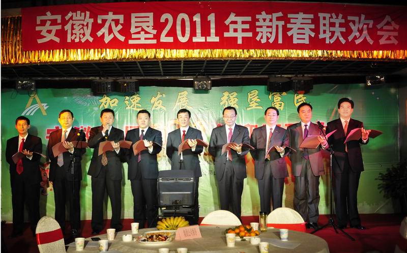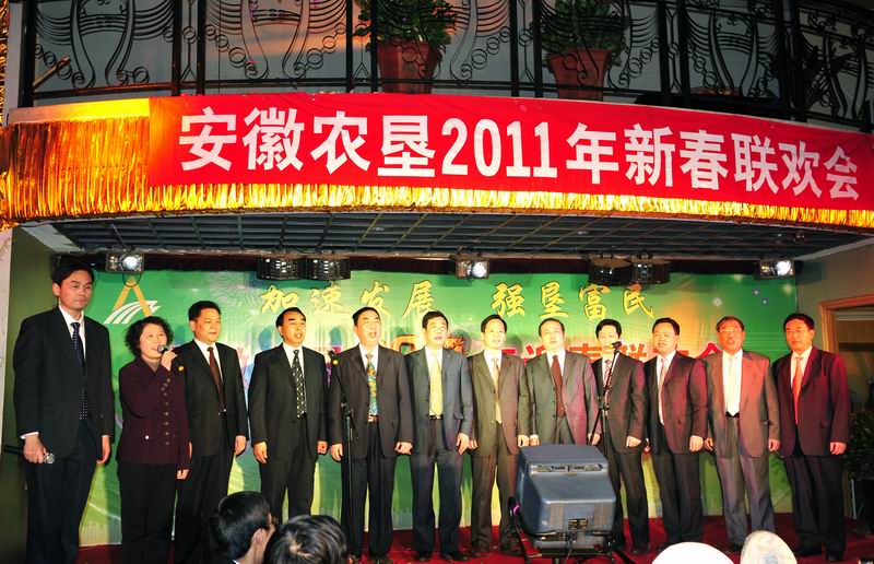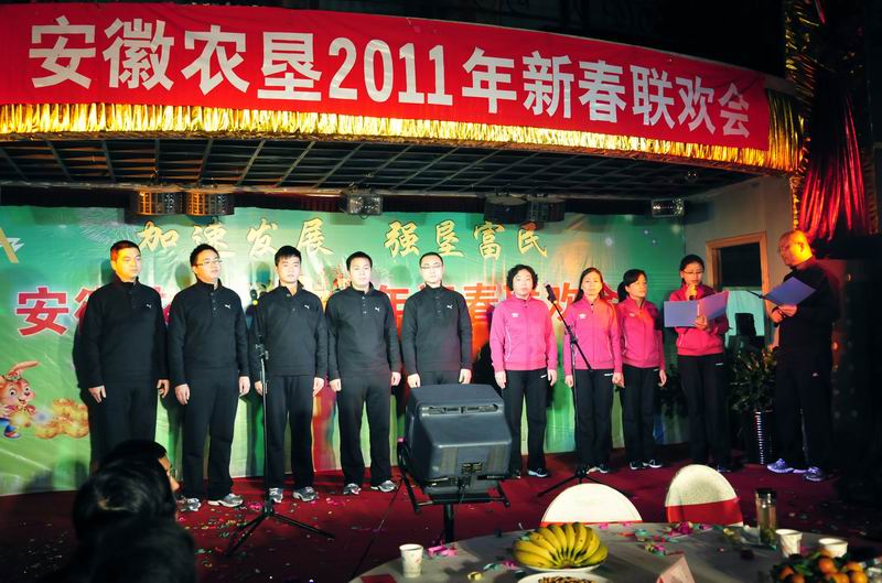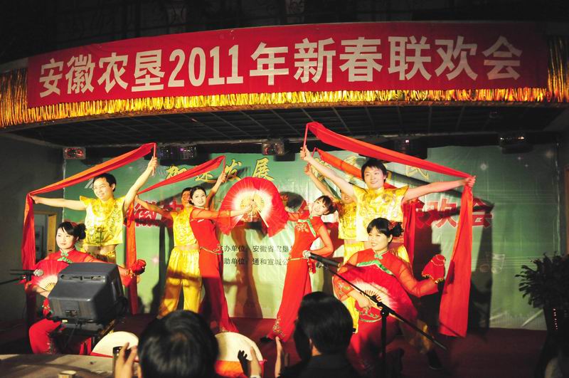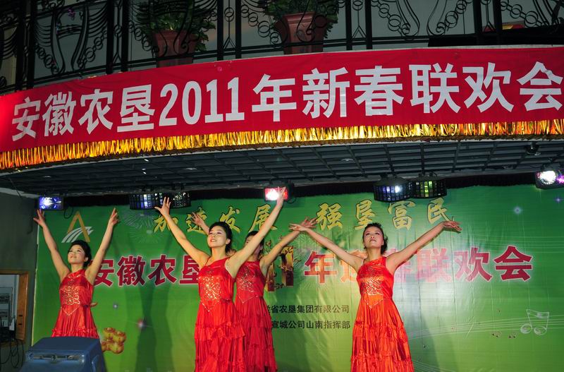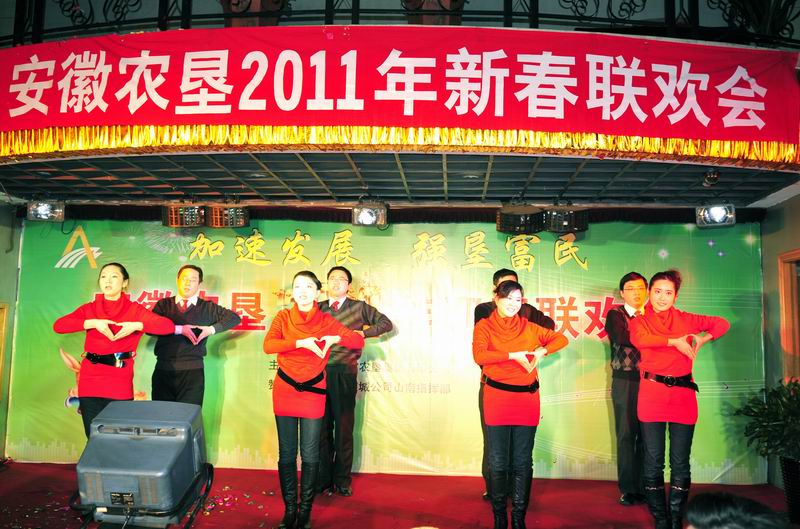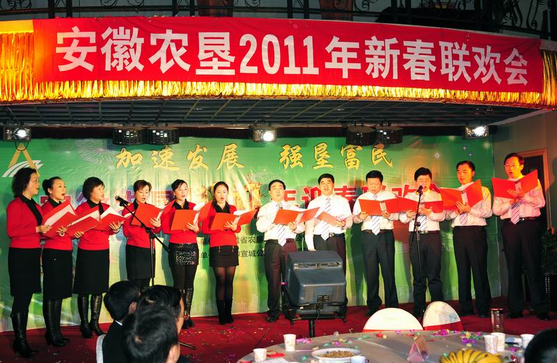 潮涌皖垦千帆竞,一元复始绘新景。新春伊始,1月17日下午,一台由省安徽省农垦集团公司主办、安徽通和宣城公司山南指挥部赞助的 “安徽农垦2011年新春联欢会”在省农垦新长城大酒店隆重举行,联欢会在一曲欢快的《好日子》歌舞拉开了大幕,省农垦集团公司领导班子首先集体合唱了《喀秋莎》《走进新时代》《大坂城姑娘》三首歌曲,掀起了联欢会的第一个高潮,接着来自集团公司机关各部室和在肥企业工作人员,表演了自编自演或改编的歌舞、小品、诗朗诵、大合唱等节目,内容丰富生动,艺术感染力强,热情讴歌了安徽农垦经济社会发展的成就和农垦人幸福生活指数的日益增长,精彩纷呈的表演不时引起全场热烈的牚声,前来参加全省农垦工作会议的垦区各农场、公司的领导一同观看了演出。联欢会上还不时穿插着互动游戏和抽奖活动,联欢会热烈奔放,高潮迭起,最后联欢会在机关部室负责人组成的合唱组的高亢的《英雄赞歌》、《歌唱祖国》歌声中结束。