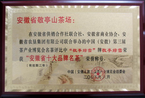 为了进一步促进安徽省茶产业发展,优化配置茶产业生产经营资源,提升安徽名牌形象,扩大市场消费,加快农村经济快速发展,由安徽省供销合作社联合社、安徽省农垦集团有限公司、安徽省商业协会主办,安徽省经济委员会、安徽省农业委员会支持的中国(安徽)第三届茶产业博览会日前在合肥落下帷幕。此次茶产业博览会,通过宣传推介、展览展销、发展研讨和竞赛评比等多种形式,对全省系列茶产品开展评优活动。敬亭山茶场的历史文化名茶——敬亭绿雪再次荣获“安徽省十大品牌名茶”称号