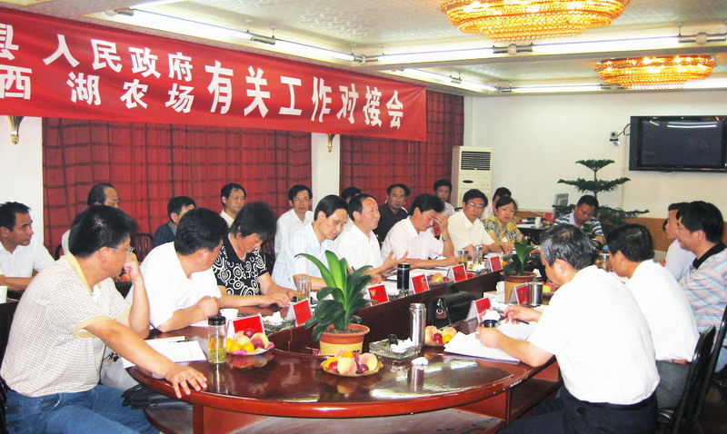 为切实加强场县合作,促进农场融入地方经济,实现场县共荣,7月13日下午,寿县人民政府、寿西湖农场有关工作对接会在寿西湖农场举行。寿县人民政府县长张绪鹏、七位分管工作副县长、十二位有关科局负责人以及寿西湖农场全体领导、正阳关农场负责人出席会议。