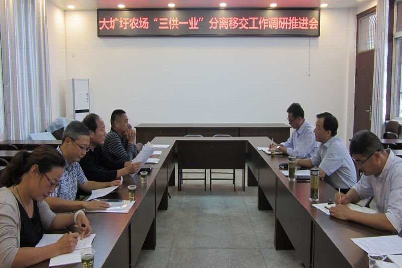 调研推进会上,杨朝幸向吴汉金一行汇报了农场“三供一业”基本情况、分离移交存在的主要问题及下一步工作设想。宾主双方就此展开了深入交流探讨。