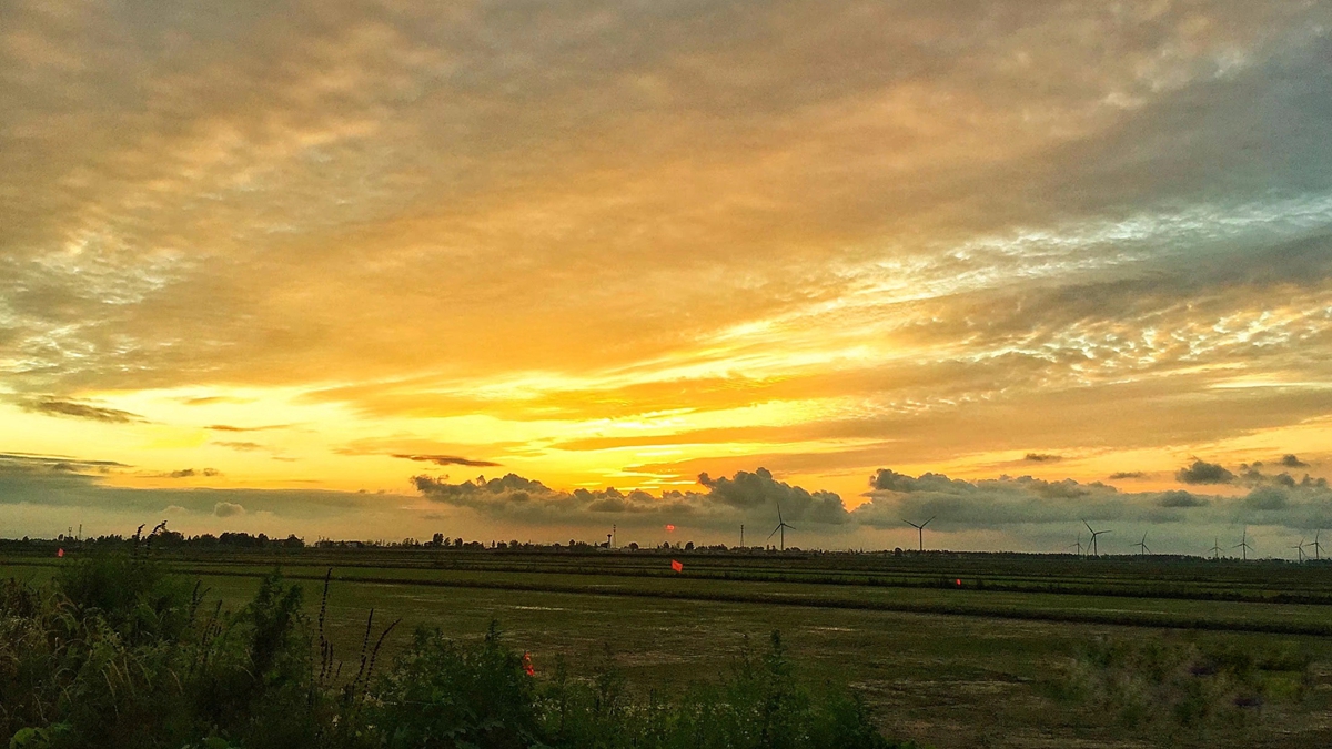 图一:雨后的朝霞映照在农场广袤的大地上,即将蓬勃而出的太阳带来的是生机盎然的一天。