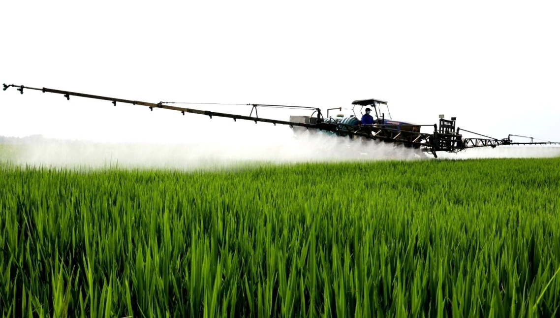 安徽农垦龙亢农场正利用高地隙植保机实施水稻综合防治喷施作业。