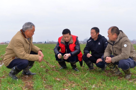 2月23日,农业技术员深入田地查看苗情,实地开展春季田管技术指导服务(薛晓旭 摄)