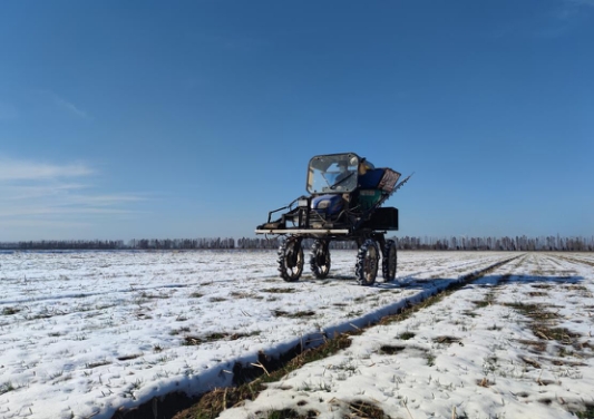 2月16日,华阳河农场农机手驾驶大型植保机械进行小麦喷肥施药作业。(李龙  摄)