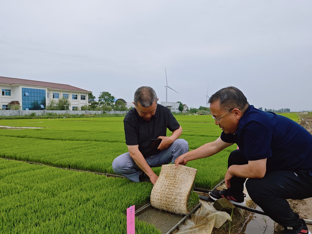 华阳河农场水稻育秧现场,农科所技术人员正在查看秧苗扎根生长情况。包丹凤