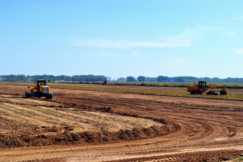 10月5日,在安徽农垦潘村湖农场,大型工程机械正在进行耕地平整作业。土地整治项目完成后,全场3.2万亩耕地都将升级为地表平整、沟渠配套的高标准良田。(安徽日报2013年10月9日A2版,杨登宏摄)