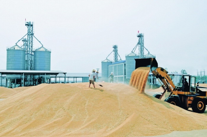 安徽垦区全面落实各项先进的农业生产技术措施,战胜了去冬今春小麦生长前期低温多雨、后期干旱的天气影响和小麦病虫害发生,迎来了又一个丰收年。预计全系统小麦平均亩产可达425公斤,其中沿淮农场全面实现了万亩千斤高产目标,良种率达百分之百,实现了夏粮连续八年增产。图为龙亢农场正在晾晒归仓小麦。(农民日报62101 鲍广云摄)