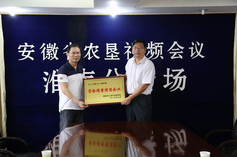 724上午,淮南市大通区市场监管局韩新军局长一行来到淮南农场,颁发了市工商局授予的“2013-2014年度守合同重信用企业奖牌。这是该农场连续第10年获此殊荣。