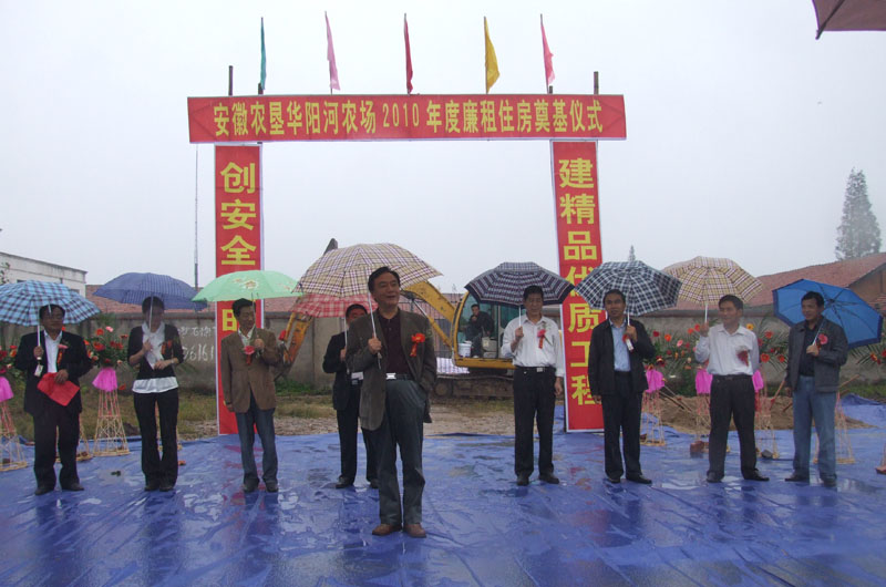 1012上午828分,安徽农垦华阳河农场第二期廉租住房项目奠基仪式如期隆重举行。省农垦集团副总经理程军出席仪式并讲话,农场副场长胡德庆代表华阳河农场致辞,施工单位、监理单位在发言中表示要将廉租房建设成为民心工程和满意工程。随后,程军副总经理宣布奠基并挥锹培土。