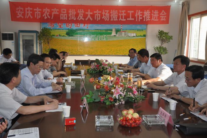 516下午,安庆市发改委会同市国土局、规划局、商务局、环保局及龙狮桥批发大市场、安徽星时空公司在皖河农场联合召开了安庆市农产品批发大市场搬迁工作推进会。