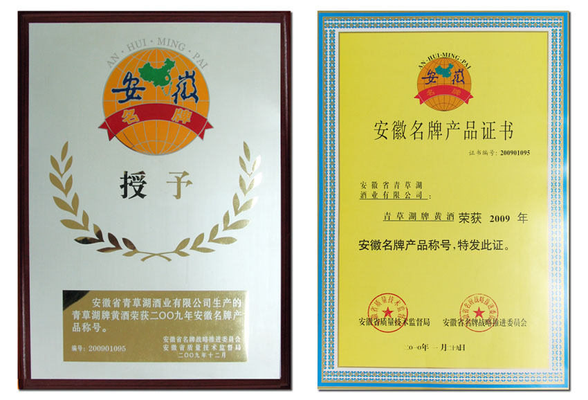 在3.15“国际消费者权益日”宣传活动中,2009年度安徽名牌表彰大会在合肥隆重举行。安徽省青草湖酒业有限公司生产的“青草湖”牌黄酒再获殊荣——2009年安徽名牌产品称号!