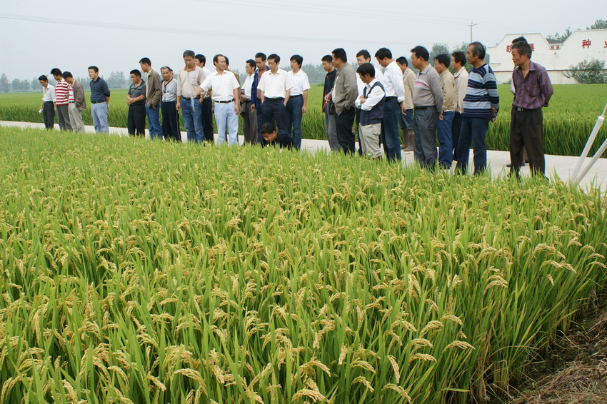 与会人员在场领导徐成银、殷文格的带领下,实地参观了农场引育种中心展示区水稻新品种长势长相。育种部门负责人逐一对展示区内所有新品种栽插时间、用肥、穗形、品种抗性、抽穗时间、熟期等对照栽培情况进行了详细介绍。