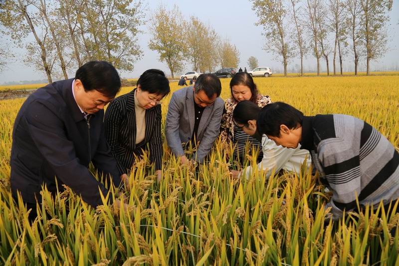 专家组听取了课题组的研究与推广报告,查阅了相关技术资料,深入各分场大田进行实地察看,对旱直播和机插秧田块按好、中、差三类进行取样测产。经测产,旱直播稻田亩均有效穗数30.44万穗,穗粒数110.23粒,实粒数105.63粒,结实率95.8%,千粒重