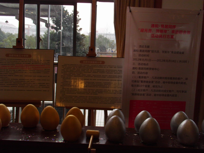 2012年元旦佳节期间,安徽农垦通和房地产集团合肥公司举办了通和·易居同辉项目系列促销活动。活动针对看房客户、成交客户设置了两类“幸运砸金蛋”:首次看房并登记信息的客户可通过槌砸“金蛋”获得奖品;购房成交客户则可通过槌砸“金蛋”获得现金奖励冲抵房款。此外,该公司还利用节假日主动“走出去”,到合肥市主要社区和商业繁华地段派发项目推介广告单页。
