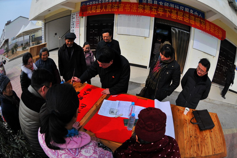 216,春风送暖,阳光明媚。方邱湖农场社区办门口,三张八仙桌一字排开,凤阳县人民法官书法家第五年下基层送温暖写春联活动在这里倾情举办,该院副院长张国云等4位法官不辞辛苦,书写不辍。从早晨到午后,农场社区职工居民满心喜悦地排队等候着人民法官现场书写的春联。