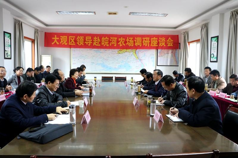 大观区一行实地参观考察了三益回民分场、长江深水岸线农场段、3万吨粮库等地。调研会上,听取了农场党委书记、场长王苏平对当前改革发展及下步工作目标、垦地合作新思路的汇报。双方就皖河农场社会职能移交后具体工作对接进行了沟通交流。