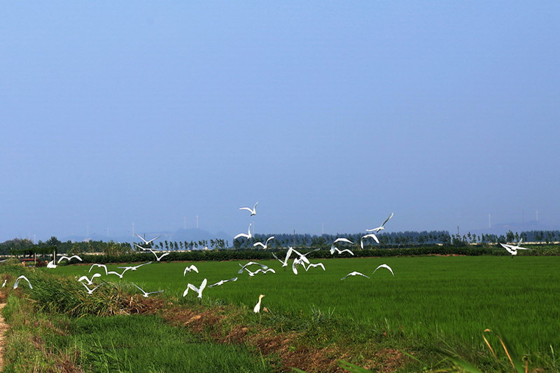 炎炎夏日,华阳河农场二分场碧绿的稻海里飞来成群结队的白鹭,舒展身姿,自由飞翔,构成了一幅生态和谐、相融成景的美图。(包丹凤摄)