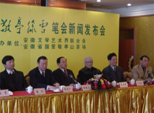 发布会由省文联书记处书记吴雪主持。他宣布, “敬亭绿雪笔会”将于今日正式启动,具体介绍了 笔会的目的、宗旨、安排和筹备情况。据悉,笔会 为期5天,分两个阶段进行,前两天,作家、艺术家 将参观安徽省农垦敬亭山茶场和敬亭山国家森林公 园,安徽农业大学茶艺表演队还将现场为作家、艺 术家进行“敬亭绿雪”的茶艺表演,艺术家与茶叶 专家对话,研究茶文化、宣传茶文化,提升“敬亭 绿雪”文化底蕴;后两天,作家、艺术家将前往皖 南采风,领略徽州文化和感受自然风光。此次活动 重在实现三个方面的结合,即名家、名茶、名山相 结合;品茶、观景相结合;参观敬亭山茶场和游览 黄山等徽州风光相结合。给作家提供深入生活,了 解安徽,了解安徽农垦,激发创作灵感的机会;给 企业提供宣传品牌的机会。敬亭山茶场场长林启仁 向与会领导、文艺家、新闻记者表示欢迎和感谢。