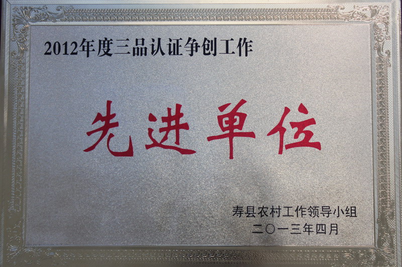 近日,寿县农村工作领导小组授予正阳关农场“2012年度三品认证争创工作先进单位称号。