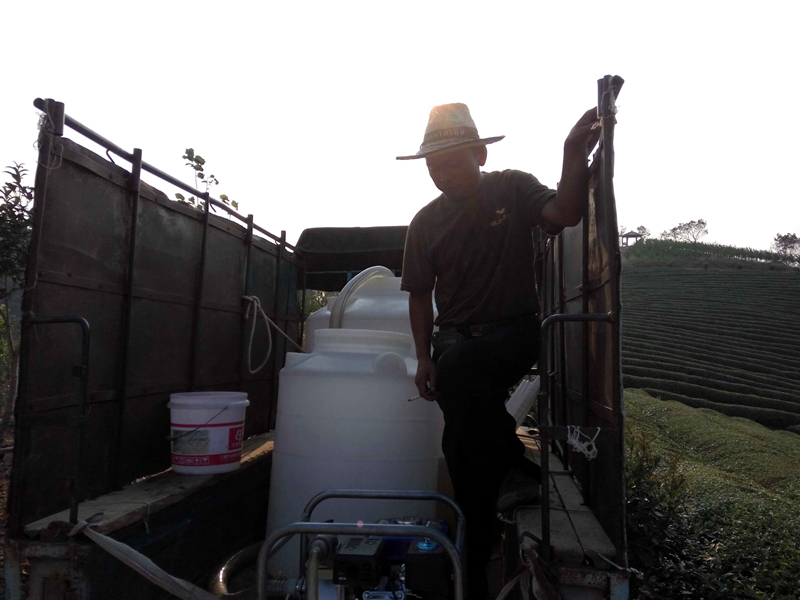 山北分场葫芦山,冯正云家承租的茶园占了半个山头,现在不少茶树有一些晒焦了,但总体看上去仍是绿意葱葱、充满生机,这得益于他定时给茶园浇水。每天下午4、5点钟,冯正云就带着家人,开着三轮车装上满桶清水,上山给他的茶园浇灌,一人浇水,一人抬水管,一人盯水压泵。一桶桶清水从山下运到山上,从车上顺着水管喷向茶行每一个干涸的角落。太阳下山去,月亮升起来……。一遍水浇下来,有时要干到夜里10点多。冯家一家人始终没有停歇,这样坚持快10天了。