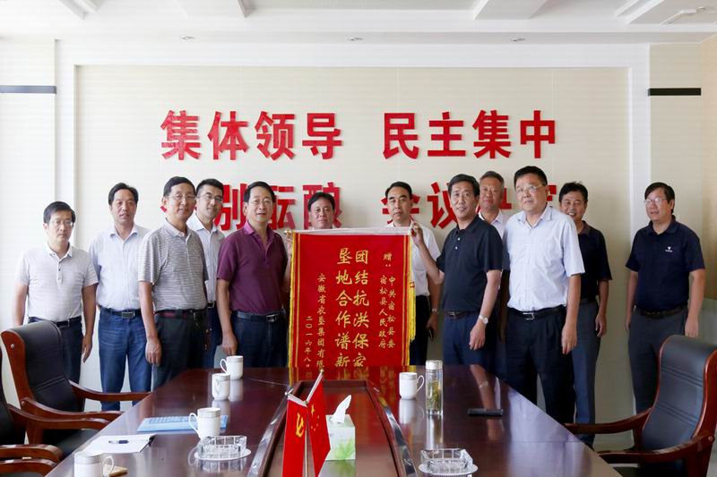送别武警官兵后,刘超、李家堂一行又赶往宿松县,对县委县政府大力支持农场防汛表示感谢,并赠送了锦旗。刘超希望县委县政府秉承团结治水的精神,在今后农场的灾后重建工作上继续给予关心支持,把农场恢复建设与华阳河湖泊群长远规划和治理结合起来。宿松县委书记王华表示,经过近2个月的奋战,防汛取得了重大的阶段性成果。这么多年来,宿松县与华阳河农场从未像防汛期间这样关系密切、感情深入,这为我们加强了解、增进友谊提供了契机,希望借力省委省政府推进农垦改革发展实施意见的出台,进一步加强垦地合作,拓宽双方合作领域,把这种良好的势头保持下去、发展下去。