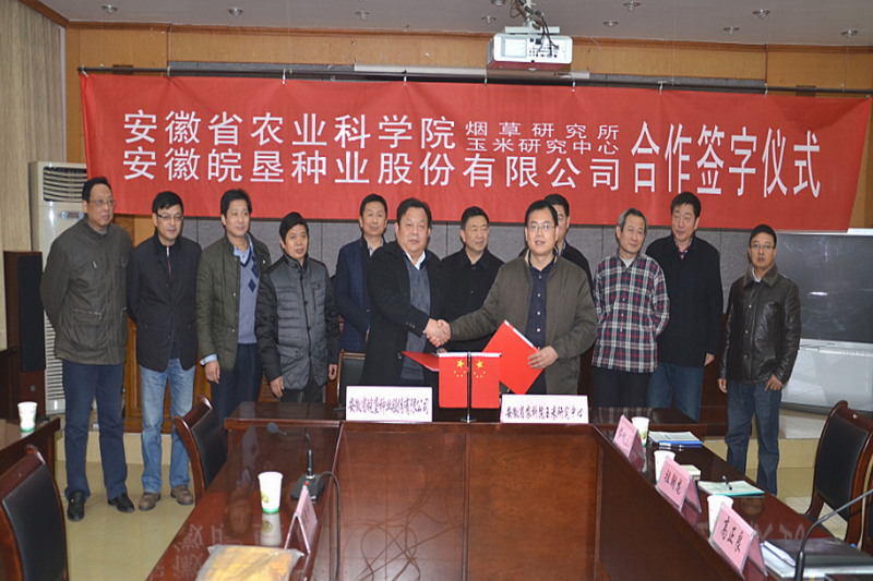 1127,皖垦种业股份有限公司与省农科院玉米研究中心、烟草研究所举行玉米增产合作签约仪式,力图实现强强联手、优势互补。省农垦集团党委委员、皖垦种业总经理王占廷,省农科院副院长胡宝成到场祝贺并见证签约。