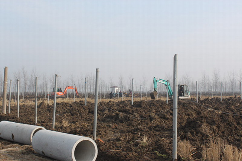 1月28日,安徽淮南农场现代农业园特色葡萄种植区内,十几台挖掘机在翻土开沟,几台拖拉机运来有机肥分发给葡萄种植户施用。