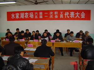 2月27日,水家湖农场六届一次职工代表大会暨五届 一次会员大会经过精心筹备胜利召开。上午8时,在 雄壮的《义勇军进行曲》中,大会正式开始。场长 陈仁虎作了题为《凝心聚力抓发展,固本强基促增 收,为全面建设社会主义新农场而努力奋斗》的工 作报告,工会主席王计文作了题为《一手抓建家, 一手抓帮扶,团结和动员职工为建设社会主义新农 场而奋斗》的工会报告。会议还听取了财务科关于 05年财务决算和06年预算的报告、规划科关于加强 土地管理的若干规定的报告、政治处关于人才工作 的若干规定的报告、企划部关于加快工业化城镇化 发展战略若干意见的报告,提请代表予以审议。27 日下午,代表们乘车参观了合肥双凤工业区、长丰 岗集镇招商工业园。本次会议将于2月28日结束。